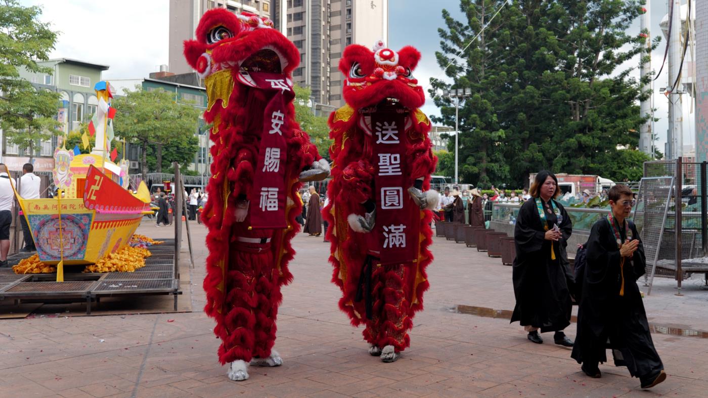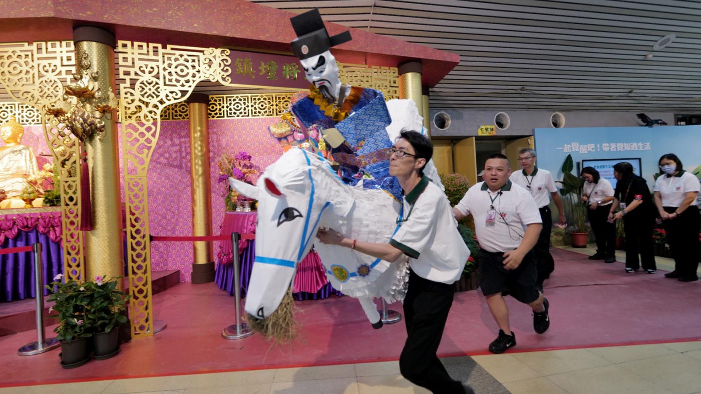 心道法師的叮囑讓大家更堅定修行的信心,而後在莊嚴肅穆送聖儀式中,信眾雙手恭捧香、花、燈、幡等物,隨著舞龍、鼓陣與舞獅的引領,隊伍繞行桃園巨蛋,信眾心中觀想累世祖先與六道群靈,在佛菩薩的接引下,登上象徵解脫的西方船,前往極樂淨土。展現眾人共同的願力,也在過程中,生起無限感恩與柔軟心。